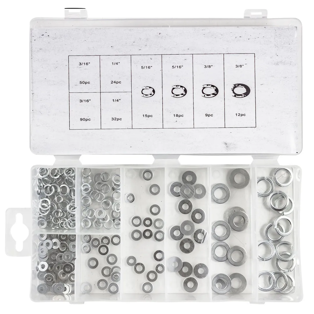 Комплектация: шайбы: 3/16"* 90 шт, 1/4"*32 шт, 5/16"*18 шт, 3/8"*12 шт; гровера: 3/16"*50 шт, 1/4"*24 шт, 5/16"*15 шт, 3/8"*9 шт.