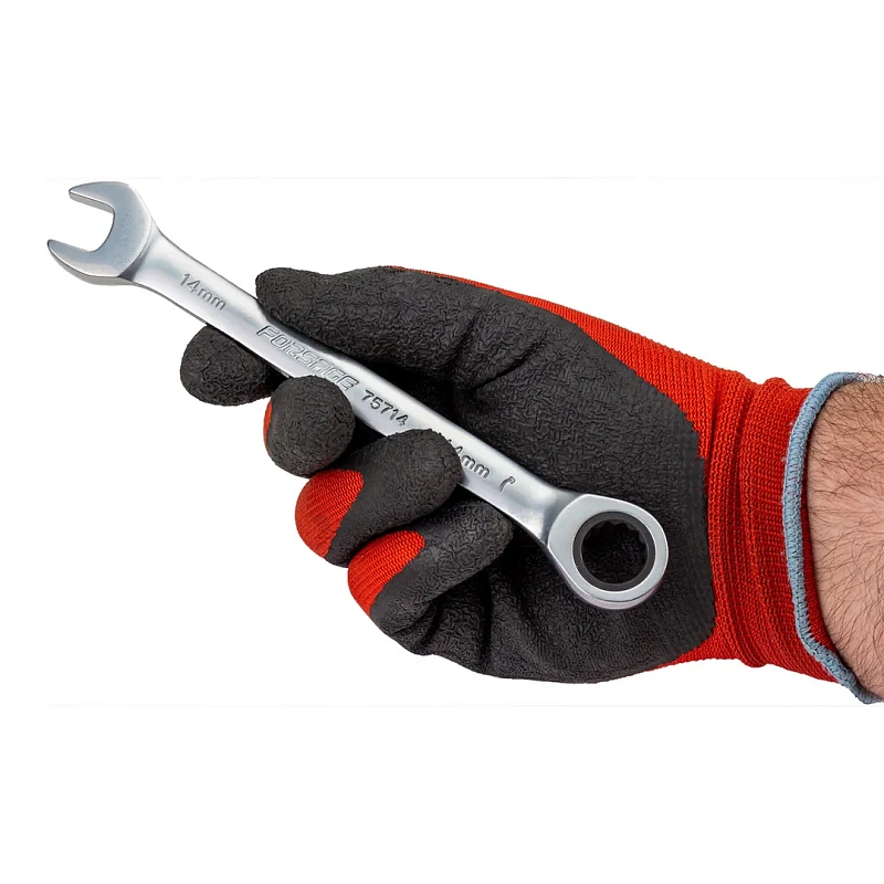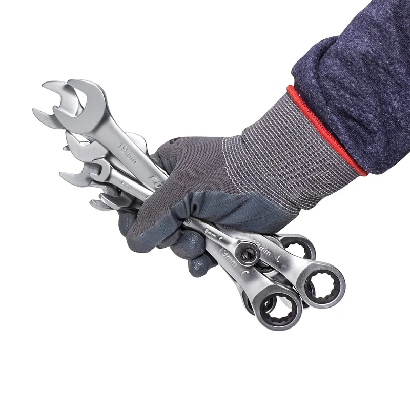 Ключи комбинированные - рожково-накидные с трещоточным механизмом. Размеры: 8, 10, 12, 13, 14, 16, 17, 18, 19 мм. В пластиковом держателе.