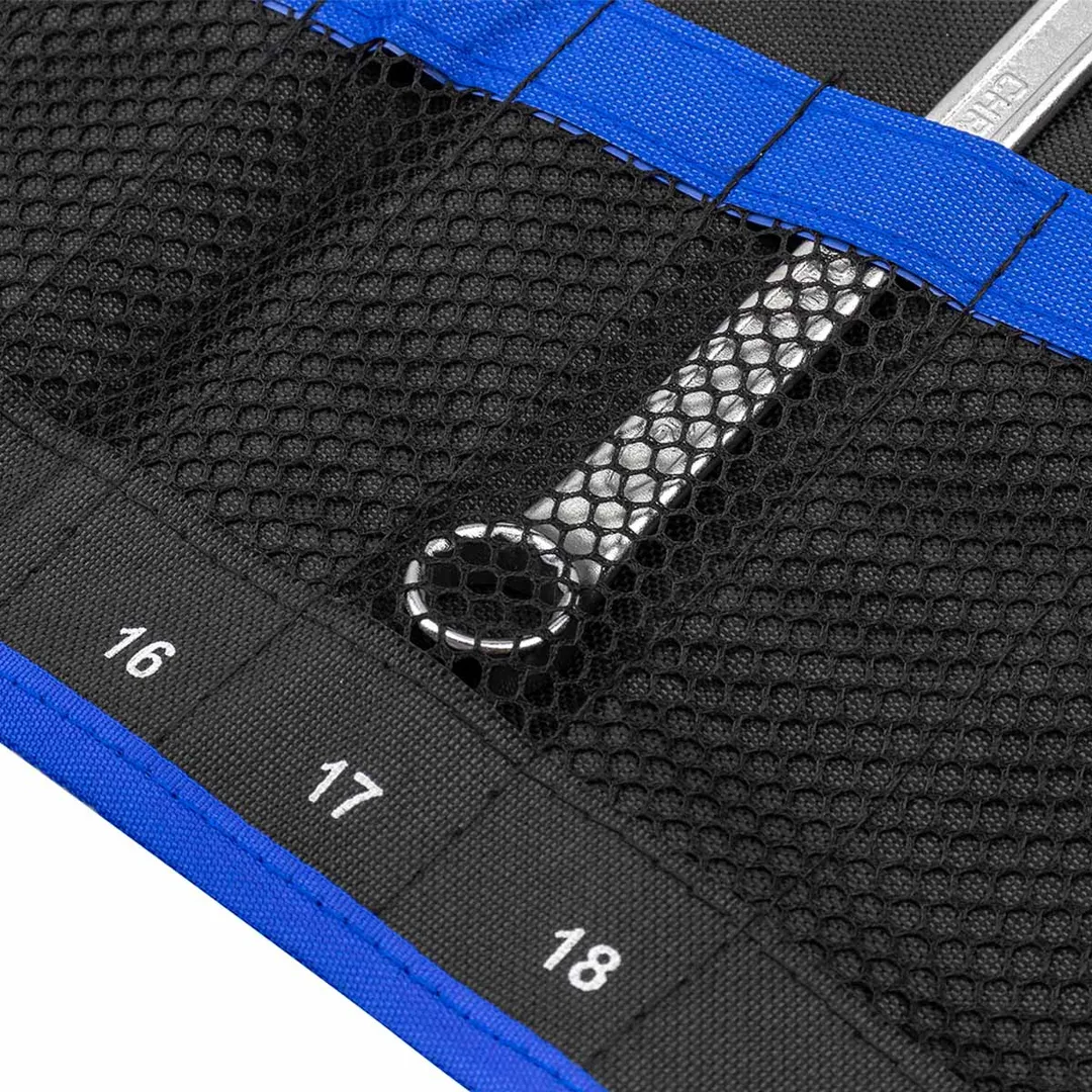 Органайзер для гаечных ключей – это хорошо продуманный аксессуар для хранения инструментов, который изготавливается для комфортного и долговечного пользования. Полотно (держатель) на 16 ключей гаечных. Чехол в развернутом виде имеет размеры 570 мм на 340 мм. Полотно-чехол для комбинированных, рожковых или накидных ключей имеет специальные отверстия с металлической оправой - они позволяют сэкономить место в гараже или мастерской, повесив набор гаечных ключей на стену или специальный стенд. Чехол-полотно для набора ключей гаечных имеет специальную фиксирующую ленту на застежке: набор комбинированных ключей можно скрутить и зафиксировать лентой.Преимущества работы с нами