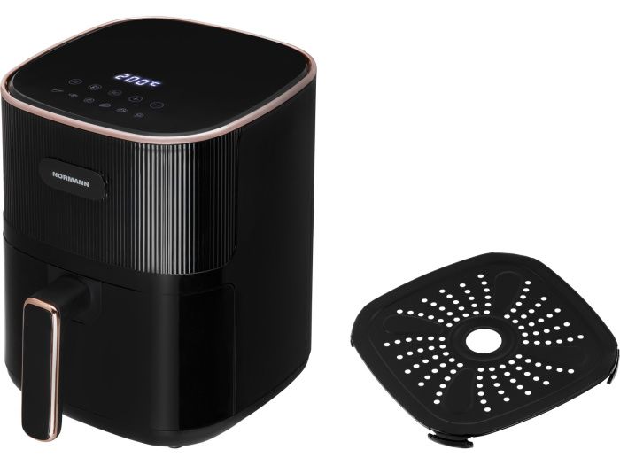 Аэрогриль черный с золотистой окантовкой. Корпус выполнен из ударопрочного пластика. Чаша объемом 3 л с антипригарным покрытием и гриль-решетка легко очищаются под струей воды или влажной губкой.