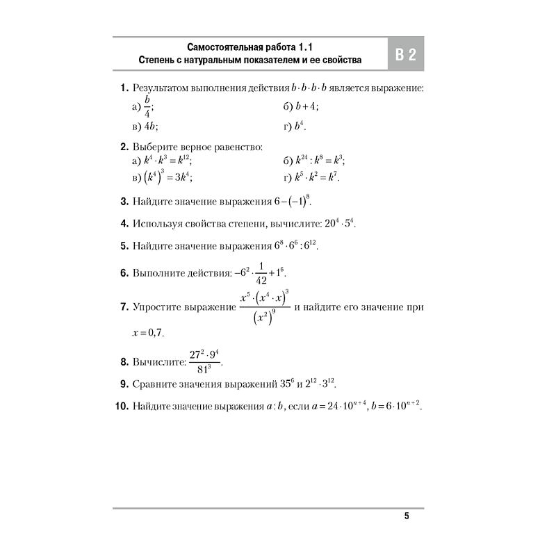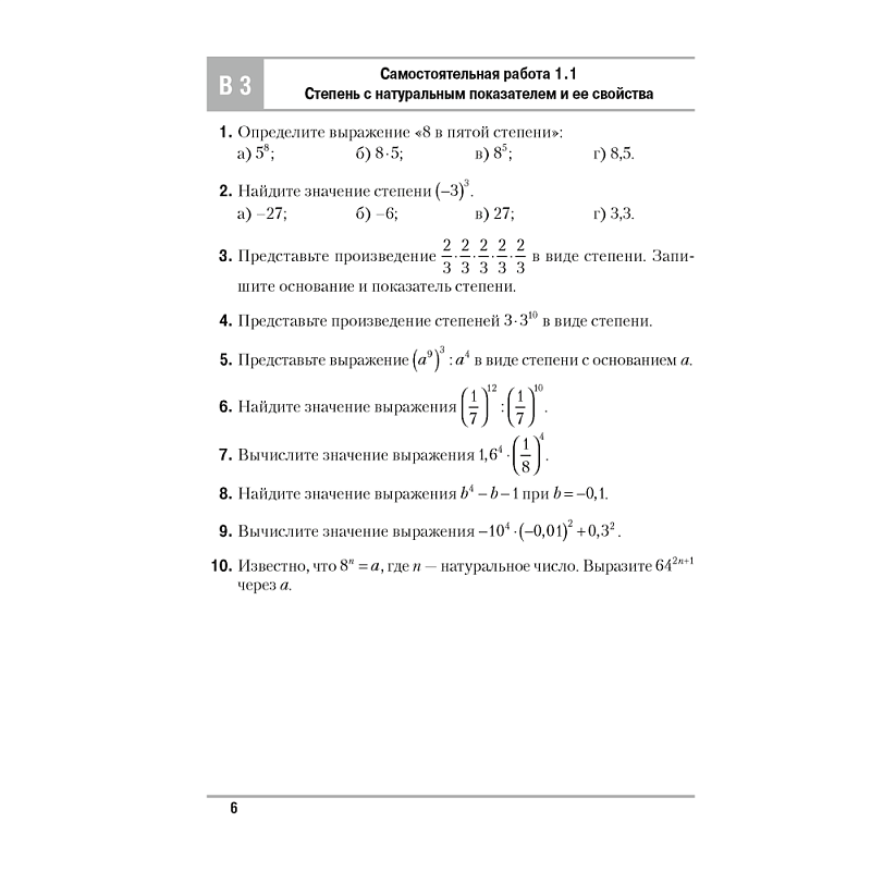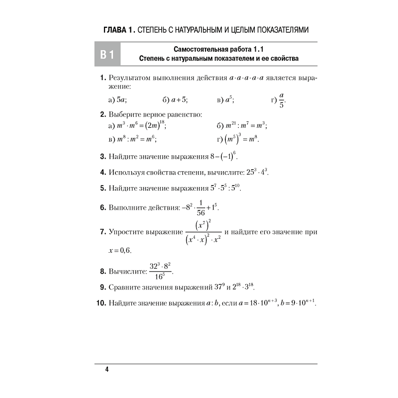 Каждая самостоятельная и контрольная работа представлена в шести вариантах. Попарно равноценными являются варианты 1 и 2, 3 и 4, 5 и 6. Варианты 5 и 6 (отмечены звездочкой) более сложные и могут быть использованы для работы с мотивированными учащимися.
