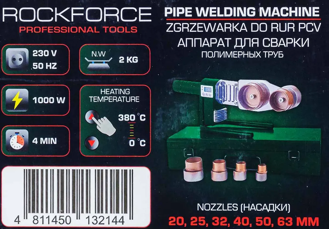 Аппарат для сварки полимерных труб 1000W, 6 насадок: 20, 25, 32, 40, 50, 63 мм RockForce RF-PW-1002, описание и характеристики: