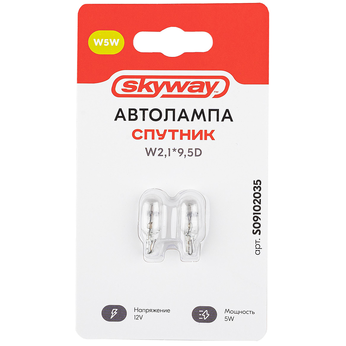 Автолампа W5W 12V 5W без цоколя W2,1*9,5 1-конт 50Лм 2500К СПУТНИК SKYWAY блистер 2 шт - автолампа W5W применяется для подключения габаритных огней, в качестве освещения гос. номера и поворотника. Излучает весьма интенсивный, но приятный для глаз водителя, световой поток. Угол рассеивания света, который производит автолампа W5W 12V, обеспечивает хорошую освещенность. Это позволяет водителю своевременно реагировать на опасность и на возможные преграды, внезапно возникшие на дороге.