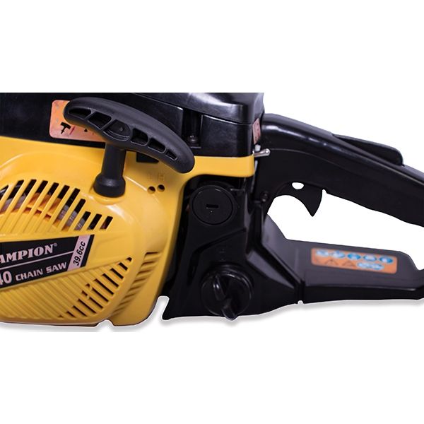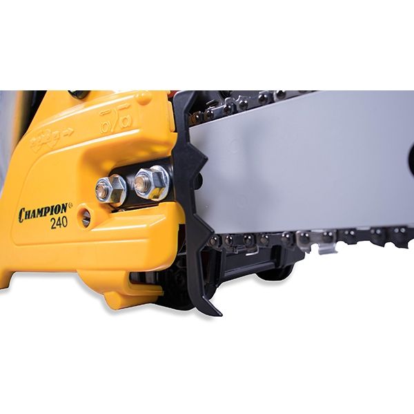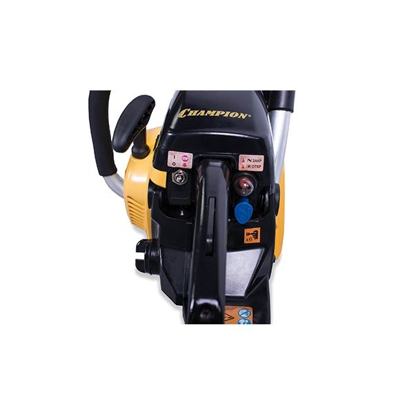 Бензопила Champion 240-16" оснащена праймером, максимально облегчающим запуск двигателя в холодную погоду или после длительного простоя, тормозом цепи и автоматической подачей масла.