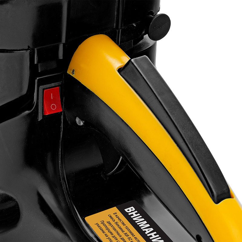 - Безопасность — режущий диск закрыт защитным кожухом, блокиратор курка газа исключает случайный запуск двигателя.