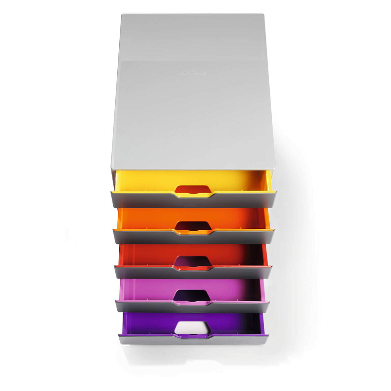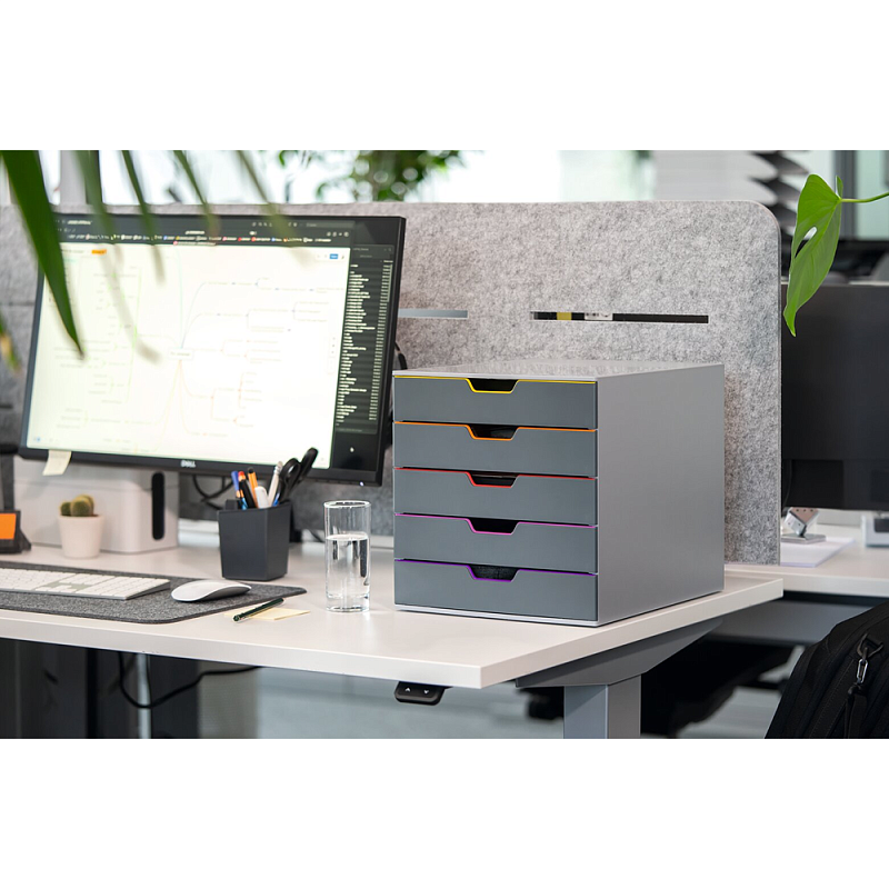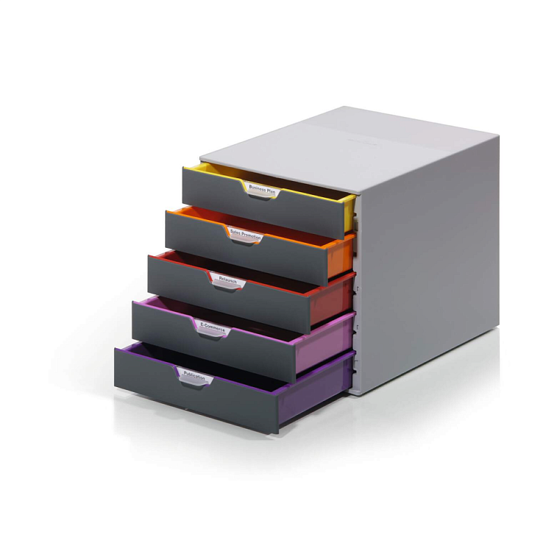 Короб для документов Varicolor с 5 выдвижными цветными ящичками. Оснащен стопорами и табуляторами для маркировки. Можно устанавливать друг на друга (фиксируется при помощи резиновых ножек). Стильный дизайн эффектно впишется в любое рабочее пространство, а цветные ящики отлично подчеркнут вашу индивидуальность.