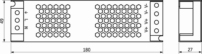Размеры 180х48х27мм. Вх. напряж. 110-220V AC, вых напряж. 24V DC, мощность 100Вт, сила тока 4. 17A, степень защиты IP20. Простой и компактный блок питания.Технические характеристики: