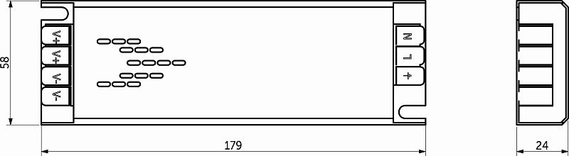 Размеры 178х58х28мм. Вх. напряж. 110-220V AC, вых напряж. 24V DC, мощность 100Вт, сила тока 4. 17A, степень защиты IP20. Имеет защитную пленку внутри корпуса. Так же есть возможность регулировки мощности освещения. Имеет функцию медленного запуска. Подключение к блоку питания осуществляется с помощью быстрозажимных клемм.Технические характеристики: