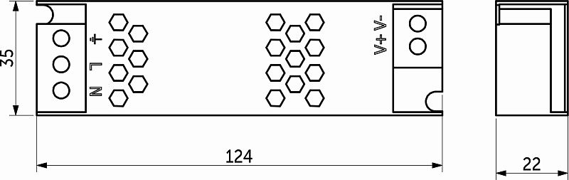 Размеры 124х35х22мм. Вх. напряж. 110-220V AC, вых напряж. 24V DC, мощность 36Вт, сила тока 1,5A, степень защиты IP20. Простой и компактный блок питания.Технические характеристики: