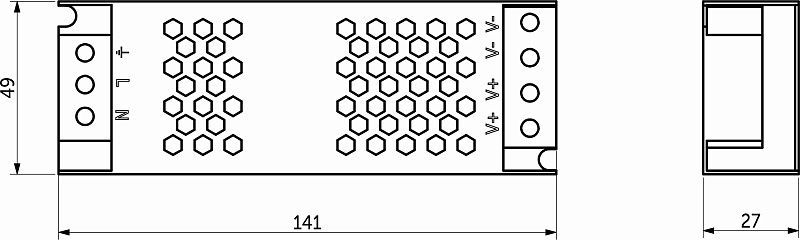 Размеры 141х49х27мм. Вх. напряж. 110-220V AC, вых напряж. 24V DC, мощность 60Вт, сила тока 2,5A, степень защиты IP20. Простой и компактный блок питания.Технические характеристики: