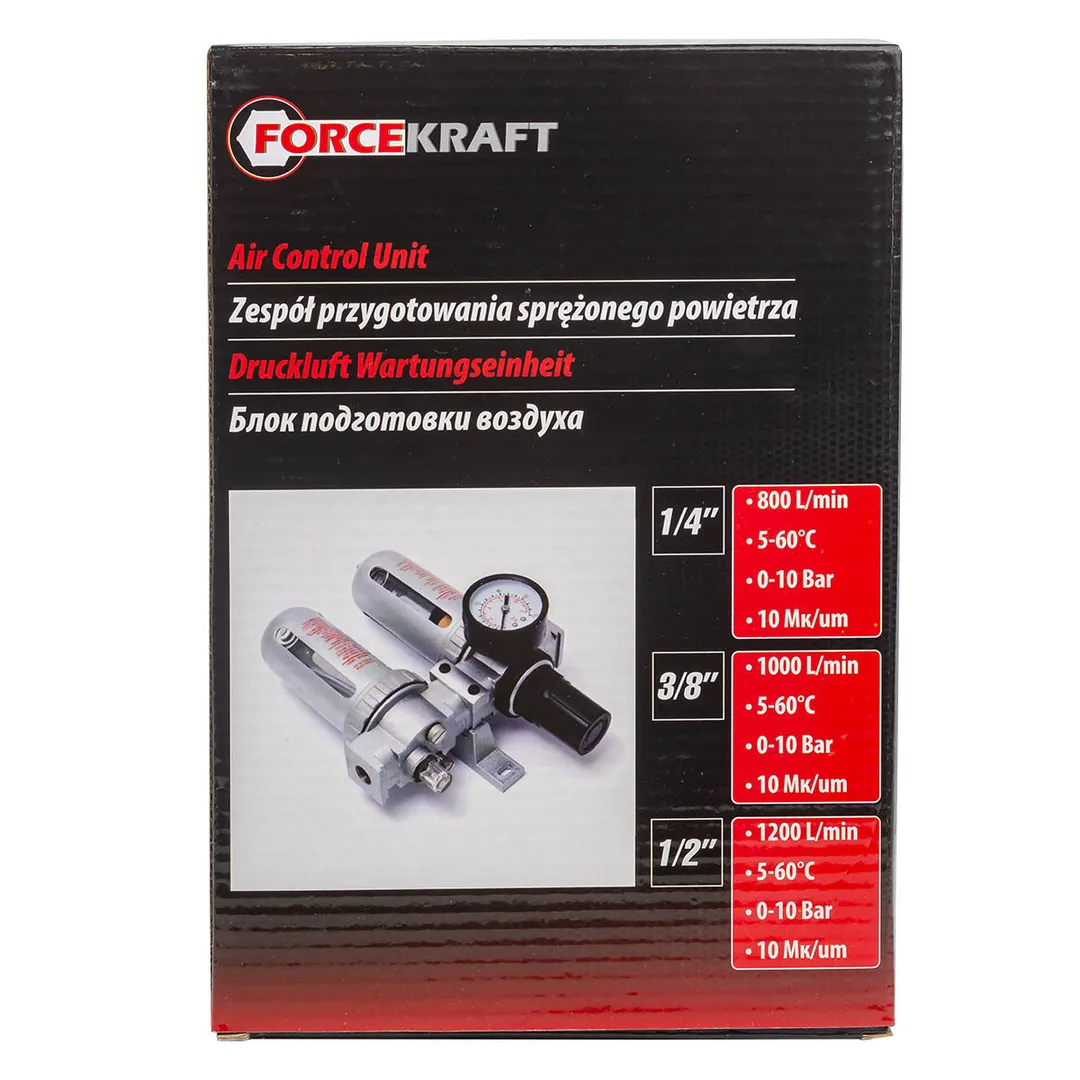 Блок подготовки воздуха 1/4'', фильтр-регулятор+лубрикатор, 10Мк, 800 л/мин, 0-10bar, раб. t 5°-60° ForceKraft FK-AFRL802