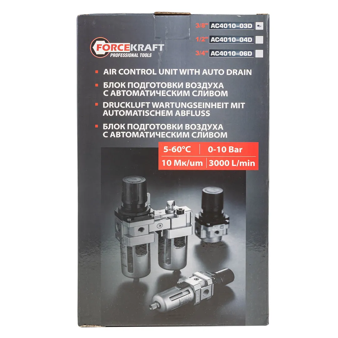 Блок подготовки воздуха, фильтр-регулятор + лубрикатор, 3/8", с автоматическим сливом ForceKraft FK-AC4010-03D, описание и характеристики: