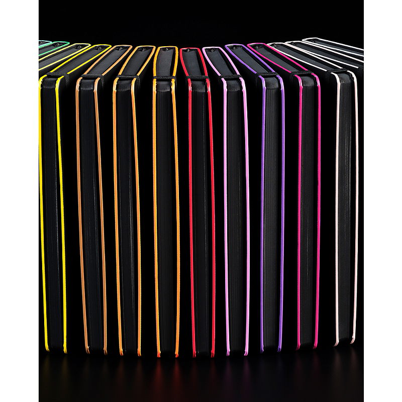 Дизайн блокнотов из коллекции Black Laser стремится к простоте, но его инновации кроются в деталях. Черный цвет обложки, цветной кант и лакированная отделка края в нескольких ярких цветах создают необыкновенный визуальный эффект, привлекающий внимание.