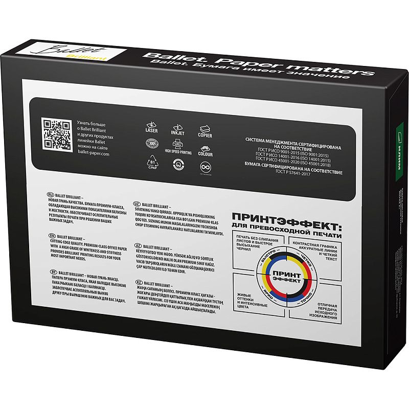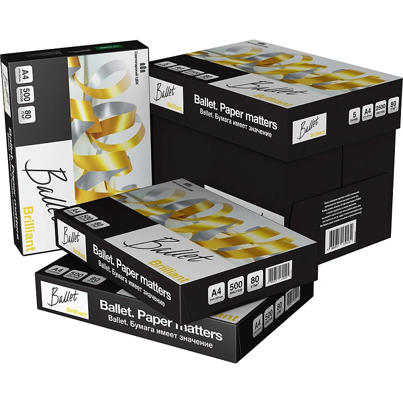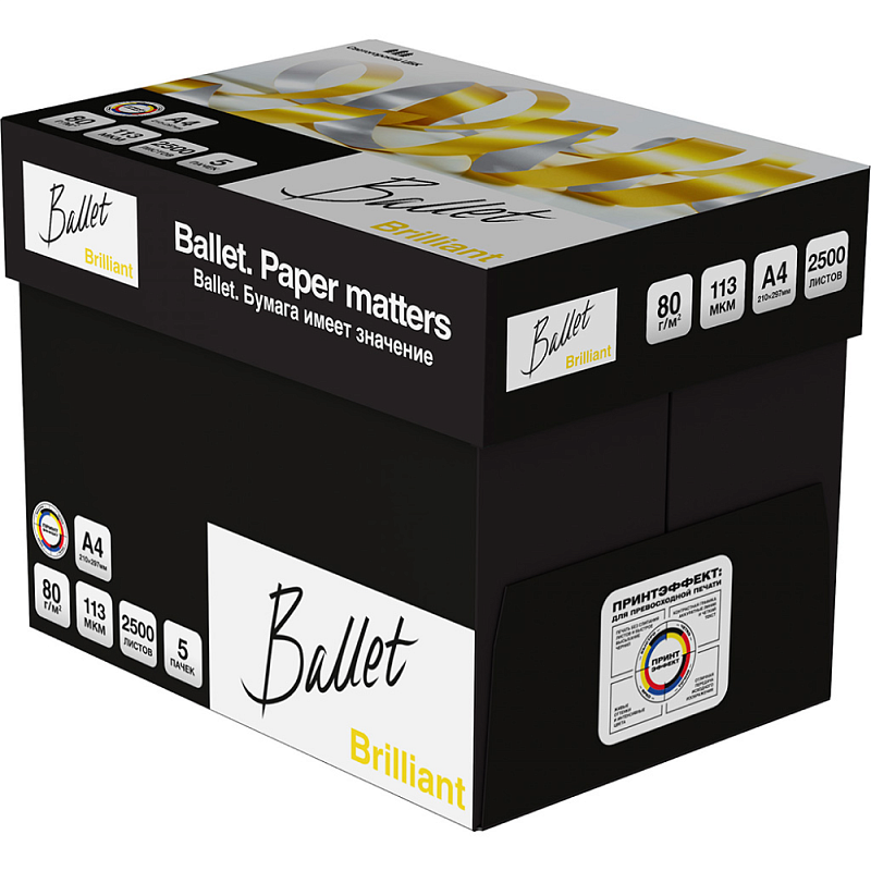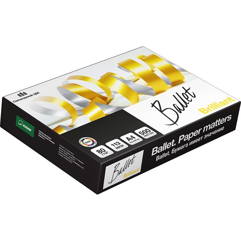 Бумаге Ballet Brilliant присвоен класс А+: это обозначение наивысшего качества на рынке. Ballet Brilliant демонстрирует превосходные показатели на любом оборудовании и способна храниться в архивах более 200 лет. Белизна - 168% CIE, яркость - 112% ISO, масса - 80 г/м².