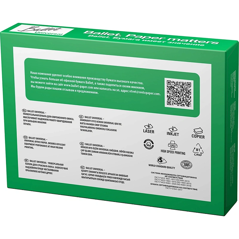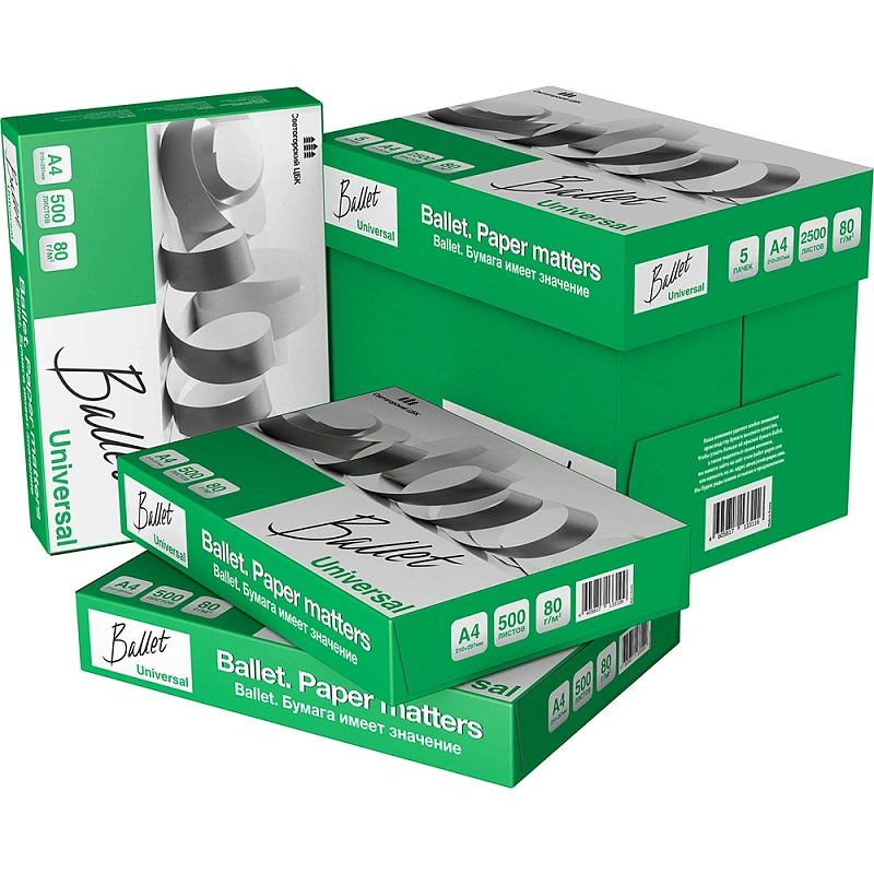 Бумага Ballet Universal - один из лучших вариантов для современного офиса. Белизна - 146% CIE, яркость - 94% ISO, масса - 80 г/м². Доступны форматы А4 и А3. Отлично подходит для офисного применения и хранения в архивах - бумага не потеряет своих качеств в течение более 200 лет! Пылимость существенно снижена: с Ballet Universal оборудование работает дольше и надежнее.