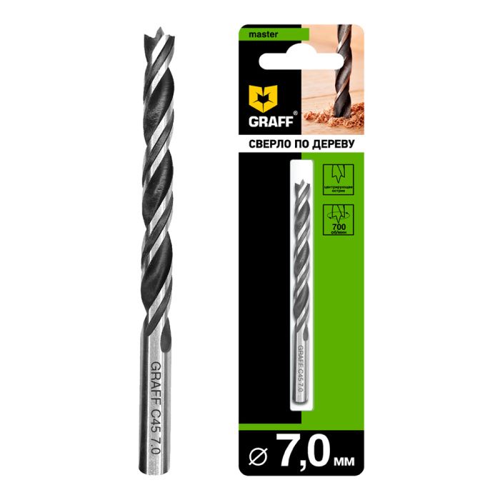 Спиральное сверло 7х109 мм GRAFF по древесине. Данная серия сверл выполнена в стандартных размерах.
