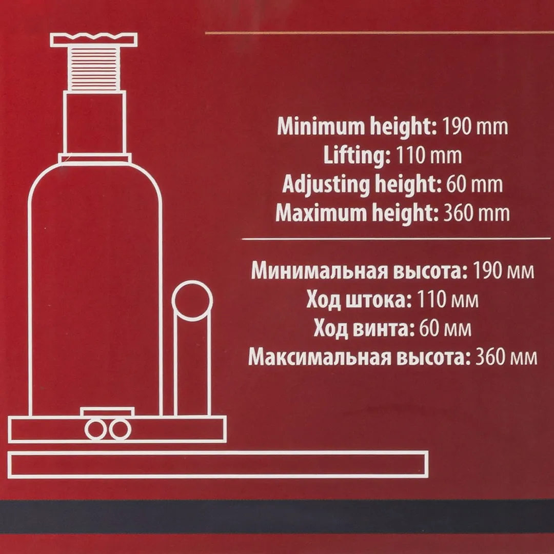 Бутылочный гидравлический домкрат - это мощное и надежное средство поднятия и удержания автомобилей. Домкрат оснащен специальным предохранительным клапаном для защиты от перегрузки. Этот домкрат обеспечивает безопасное и устойчивое поднятие, что делает его отличным выбором для использования как в автомастерских, так и для личного использования. Большой ход подъема позволяет поднимать грузы на высокую высоту, что удобно при выполнении различных видов работ. Домкрат обладает широкой и устойчивой опорой, предотвращая его опрокидывание во время подъема. Удобная рукоятка для подкачки и специальное устройство для регулировки высоты делают его легким в использовании. Грузоподъемность 8т Высота подхвата 190мм Ход штока 110мм Ход винта 60мм Максимальная высота подьема 360 мм.Преимущества работы с нами