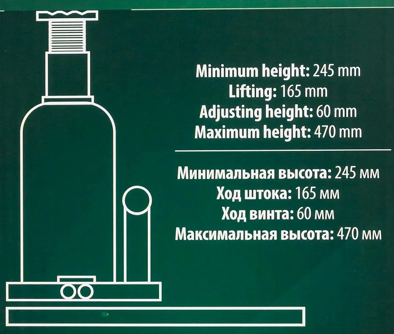 Бутылочный гидравлический домкрат. Мощное и надежное средство для поднятия и удержания автомобилей. Домкрат оснащен специальным предохранительным клапаном для защиты от перегрузки. Этот домкрат обеспечивает безопасное поднятие, что делает его отличным выбором как для автомастерских, так и для личного использования. Грузоподьемность 20т, Высота подхвата 245 мм, Ход штока 165 мм, Ход винта 60мм Максимальный уровень подъёма 370 мм.Преимущества работы с нами
