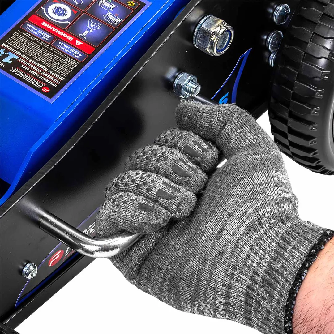 Автомобильный домкрат оборудован увеличенными колесами, которые обеспечивают работу домкрата на неровных или нетвердых поверхностях (снег, песок, грязь, неровный асфальт и тд.), а также удобной ручкой для переноски и складной рукоятью, что делает его удобным для хранения.