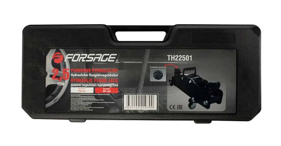 Домкрат подкатной гидравлический 2,5 т с резиновой накладкой, 135-387 мм Forsage F-TH22501 без фиксации в кейсе, описание и характеристики: