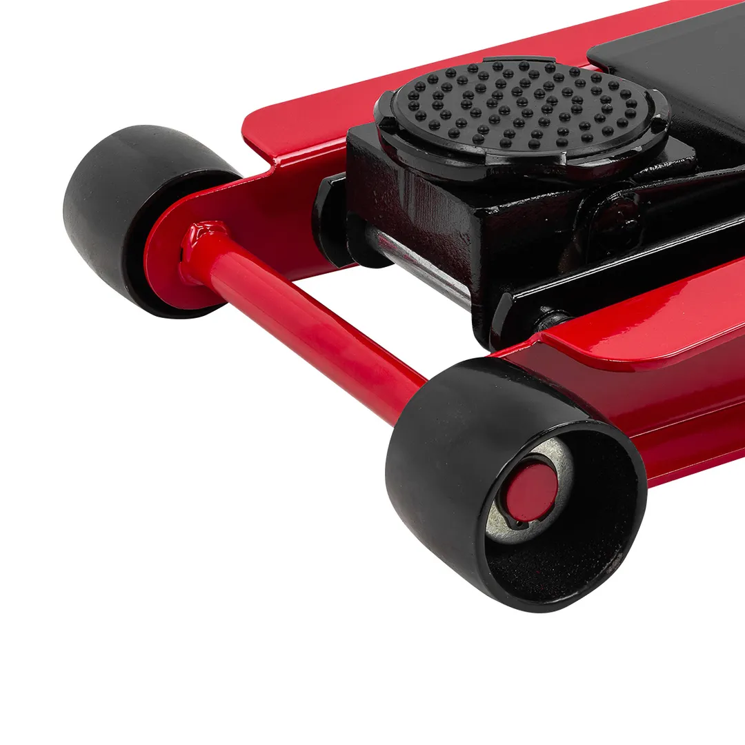 Прорезиненная накладка на рукоятке обеспечивает удобство и комфорт при использовании.Мобильность и надежность: домкрат оснащен 2 фиксированными и 2 поворотными колесами, поэтому его можно легко перемещать.