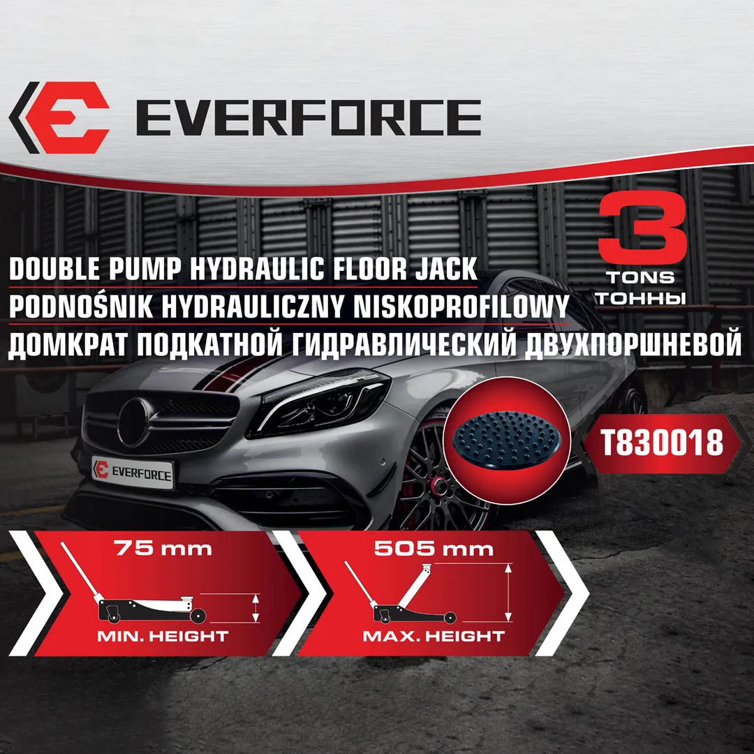 Домкрат подкатной гидравлический 3 т, 75-510 мм, низкопрофильный двухпоршневой с резиновой накладкой EVERFORCE EF-T830018, описание и характеристики: