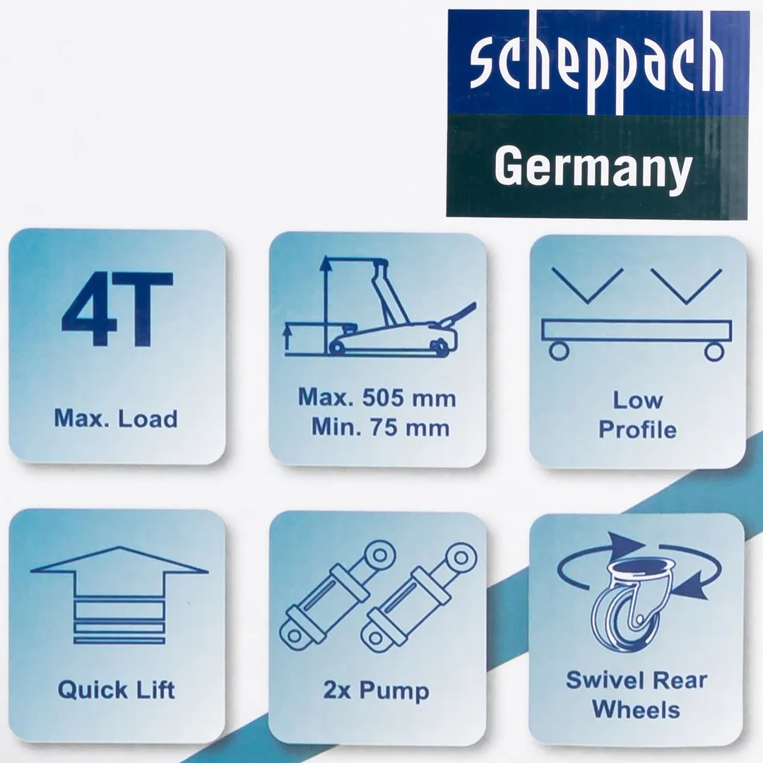 Домкрат подкатной гидравлический 4 т, 75-505 мм, низкопрофильный Scheppach Sch-T84008