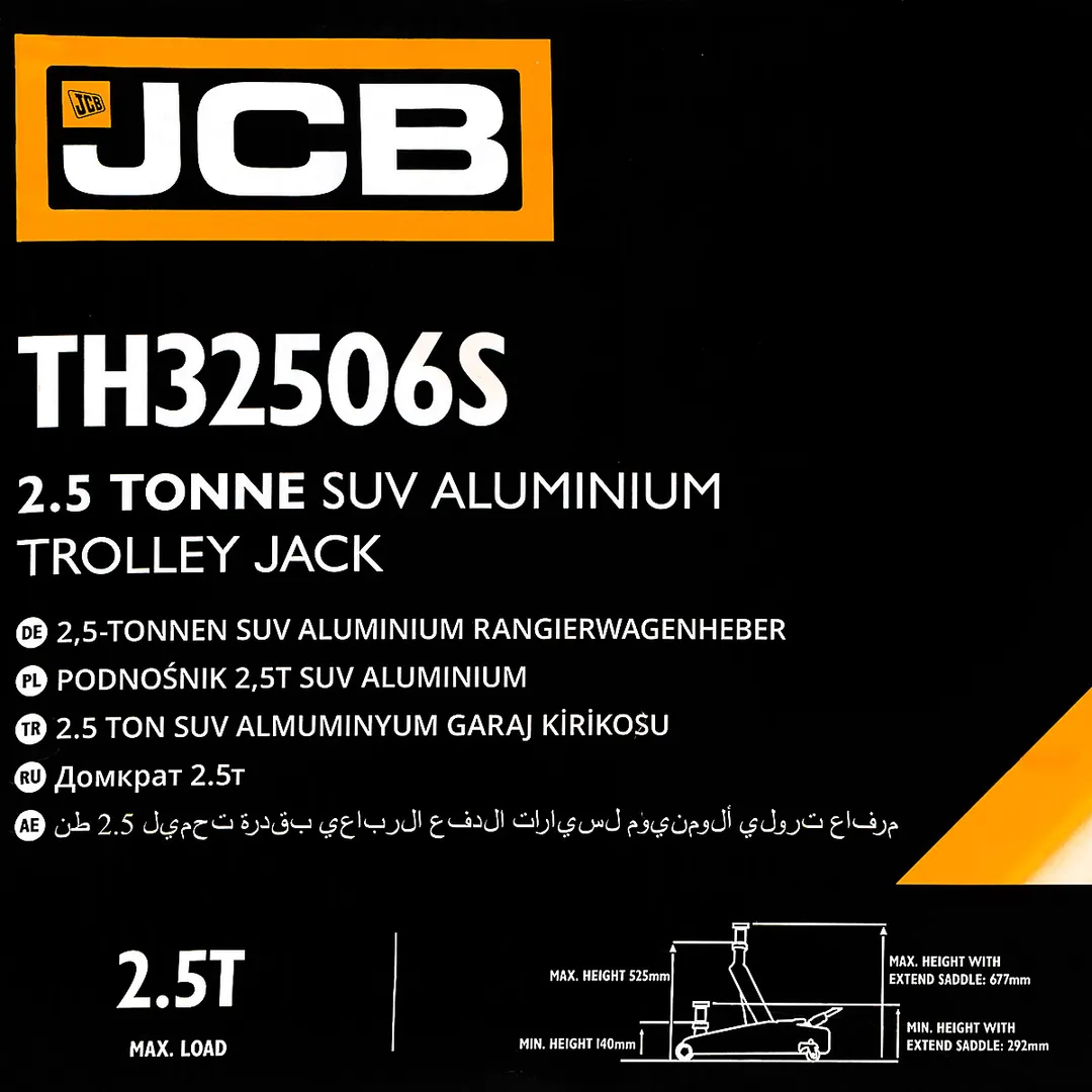 Домкрат подкатной гидравлический на резиновых колесах в комплекте с удлинителями 2,5 т, 140-677 мм JCB JCB-TH32506S, описание и характеристики: