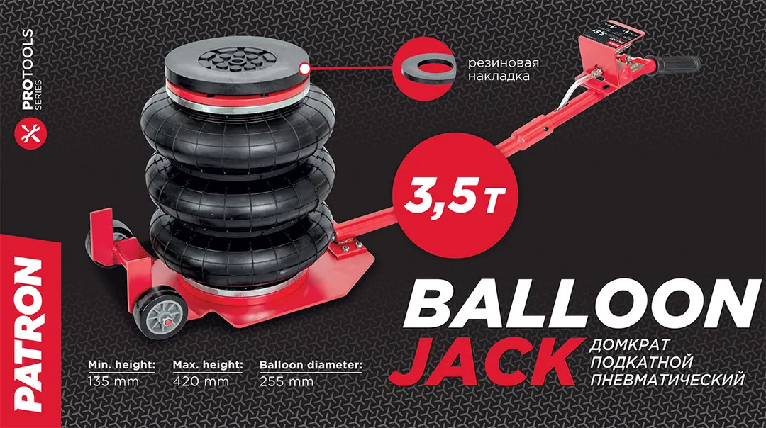 Домкрат автомобильный пневматический с грузоподъемностью до 3,5 тонн.Максимальная высота подъема 420 мм, уровень подхвата 135 мм.