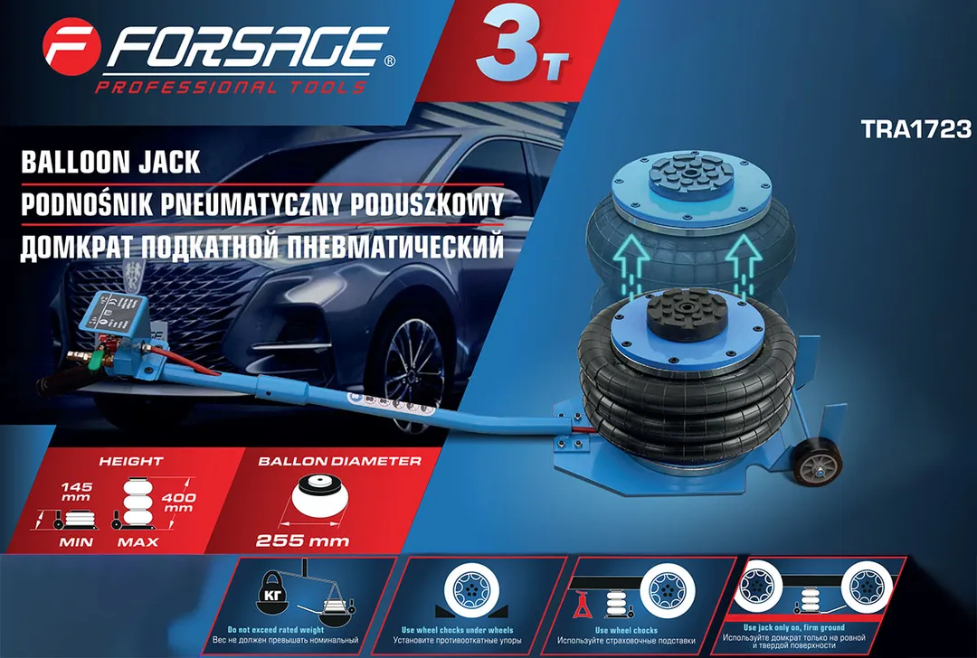 Домкрат подкатной пневматический 3 т, 145-400 мм, Ø255 мм Forsage F-TRA1723