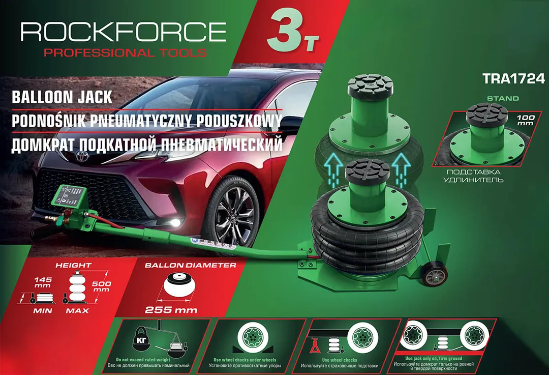 Домкрат подкатной пневматический 3 т, 145-500 мм, надставка-удлинитель 100 мм, Ø-255 мм RockForce RF-TRA1724