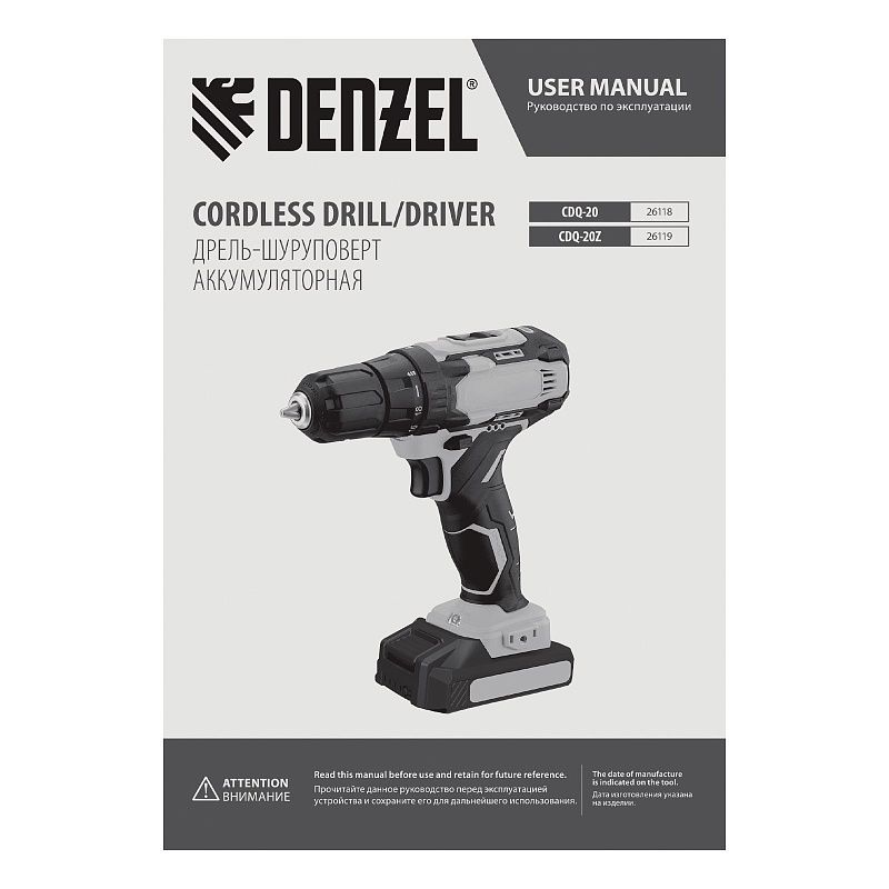 Дрель-шуруповерт аккумуляторная CDQ-20, Li-Ion, 20 В Denzel 26118, описание: