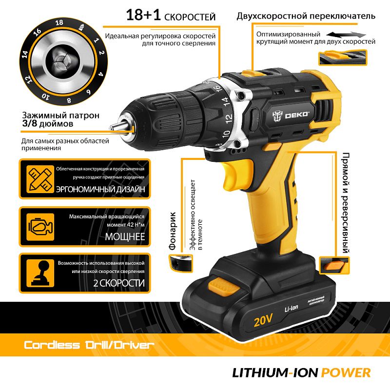 Дрель-шуруповерт аккумуляторная DKCD20FU-Li SET 63 063-4175 DEKO 063-4175, описание: