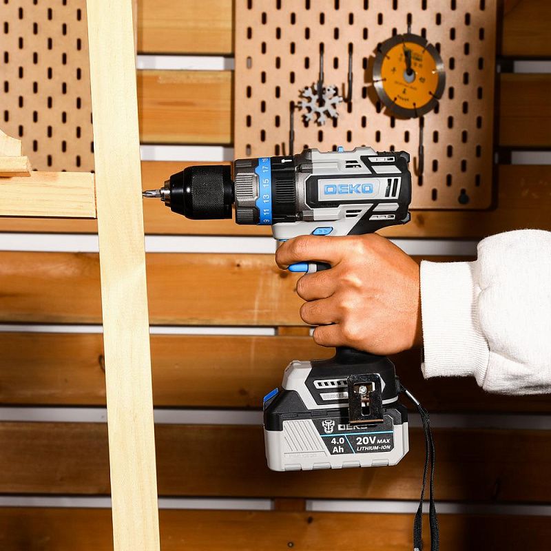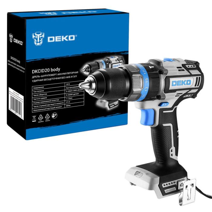 - Дрель-шуруповерт аккумуляторная ударная бесщеточная DEKO DKCID20 предназначена для сверления отверстий в различных материалах (при установке соответствующих сверл для каждого вида работ), а также для монтажа/демонтажа резьбовых соединений (при установке соответствующих бит и головок).