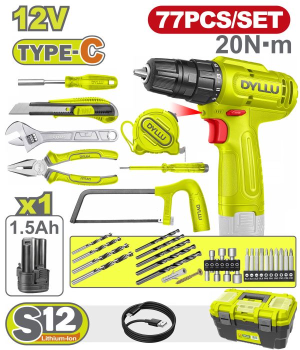 Дрель-шуруповерт с набором инструмента DYLLU DTDT4B77 (77 предметов), описание: