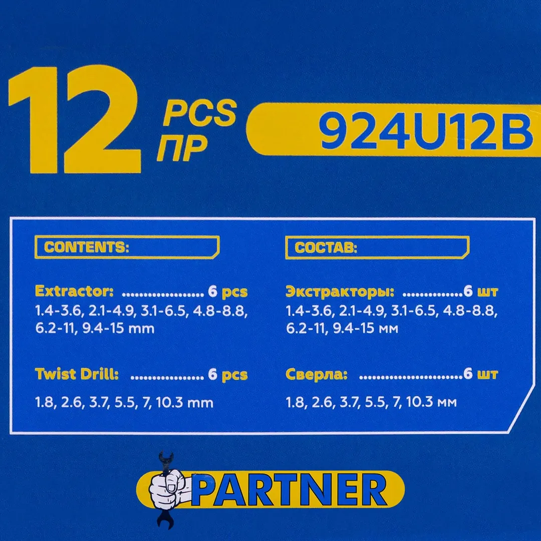 Набор экстракторов для извлечения заломанных болтов/гаек в комплекте со сверлами 12 пр Partner PA-924U12B