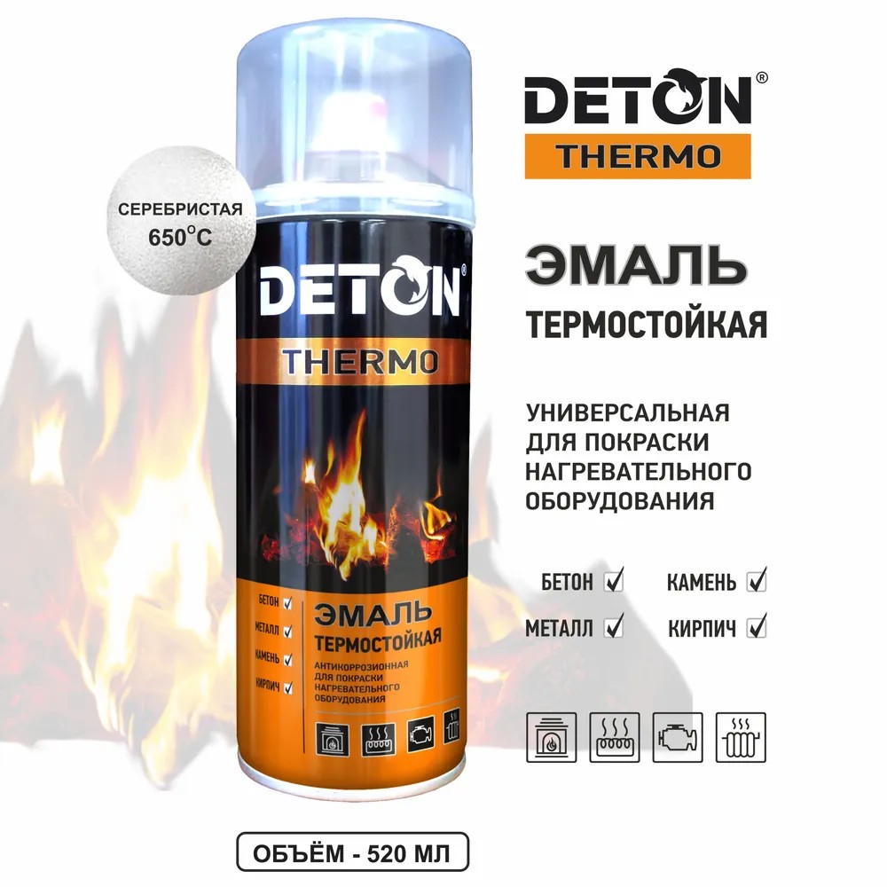 Эмаль термостойкая Серебристая DETON THERMO DTN-A70667 - Универсальная термостойка эмаль предназначена для защитной покраски кирпичных, бетонных, металлических и других поверхностей трубопроводов, котлов, каминов, печей, мангалов, деталей двигателей, выхлопных и тормозных систем автомобилей.