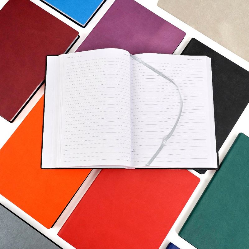 Форзацы белого цвета. Блок из белой гладкой FSC бумаги плотностью 70 гр., печать в 1 цвет - серый Pantone 404U. Шелковая закладка-ляссе серого цвета. Идеально подходит под нанесение логотипа тиснением и УФ печатью.