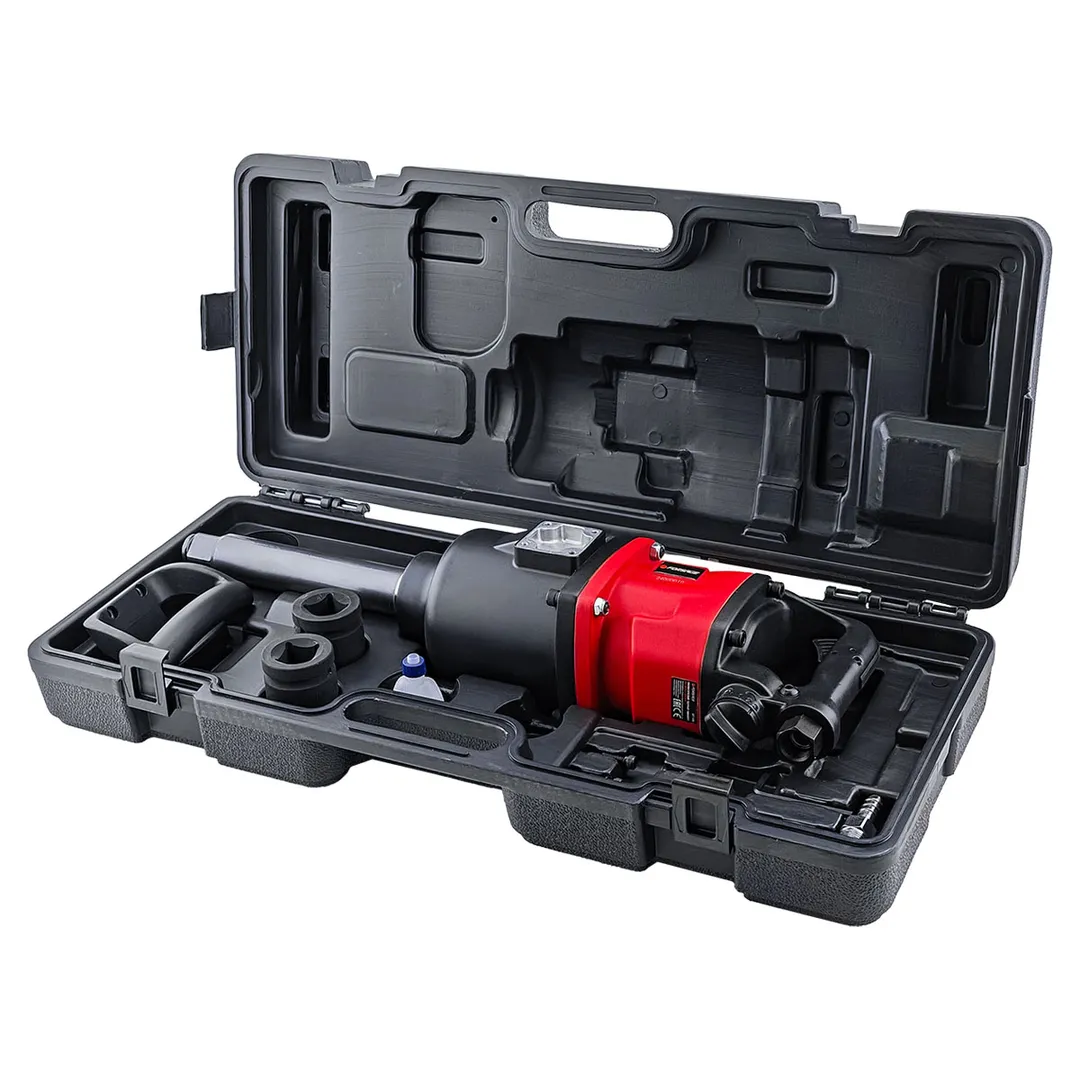 Пневматический гайковерт ударный с длинным валом оснащен квадратом шпинделя размером 1" (25,4 мм), который позволяет использовать широкий спектр головок и насадок различных размеров. За счет высокого крутящего момента и наличия эффективного ударного механизма, данный пнемвогайковерт с реверсом и регулировкой усилия способен успешно справляться с самыми высоконагруженными резьбовыми соединениями, и работать с насадками максимальных типоразмеров. Для удобства применения инструмент весом 16.3 кг оснащен основной рукоятью пистолетного типа и надежной дополнительной боковой ручкой. Инструмент комплектуется емкостью для смазки и регулировочными ключами. Пневматический ударный гайковерт с реверсом и регулировкой усилия затяжки предназначен для авторемонтных предприятий и производства работ в шиномонтажных мастерских, в том числе на грузовых автомобилях самой высокой грузоподъемности. Расход воздуха 420 л/мин; Скорость вращения на холостом ходу 3600об/мин; Максимальный крутящий момент 3100Нм; Входное отверстие под воздух 1/2"; Минимальный диаметр шланга 12мм; Общая длина 586 мм. Также в комлекте головки ударные 1" 32 мм, 33 мм.Преимущества работы с нами