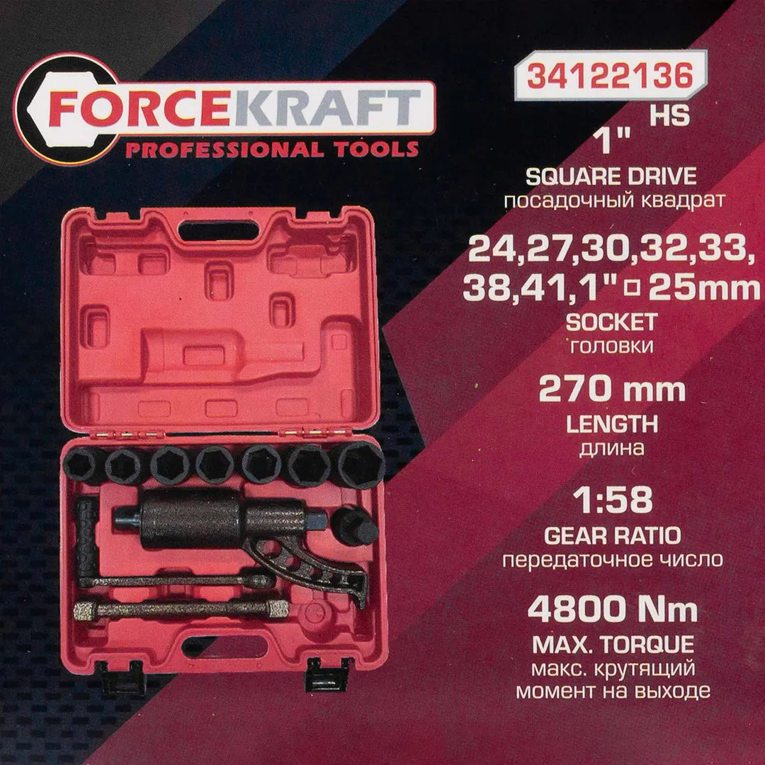 Гайковерт ручной с редуктором 1'', головки 24-41 мм, и адаптер 1'', L270 мм, передаточное число 1:58, 4800 Н/м ForceKraft FK-34122136 HS, описание и характеристики: