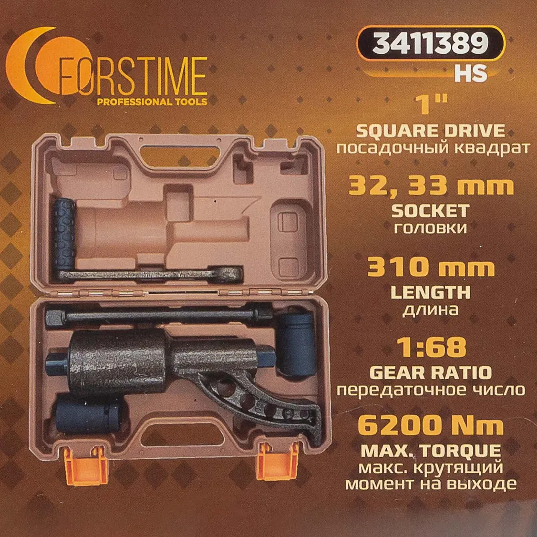 Гайковерт ручной с редуктором 1'', головки 32, 33 мм, L310 мм, передаточное число 1:68, 6200 Н/м FORSTIME FT-3411389 HS, описание и характеристики: