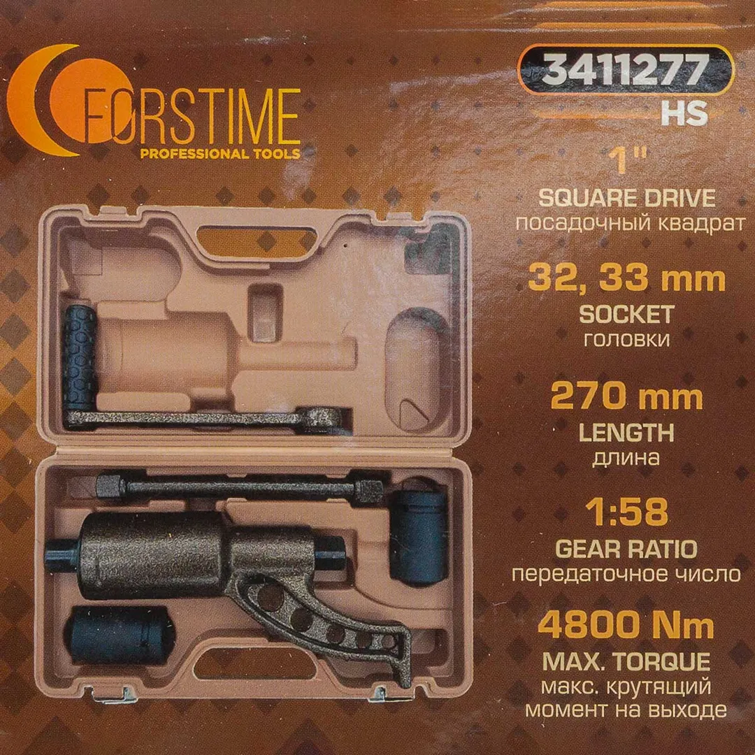 Гайковерт ручной с редуктором 1", головки 32, 33 мм, L270 мм, передаточное число 1:58, 4800 Н/м FORSTIME FT-3411277 HS, описание и характеристики: