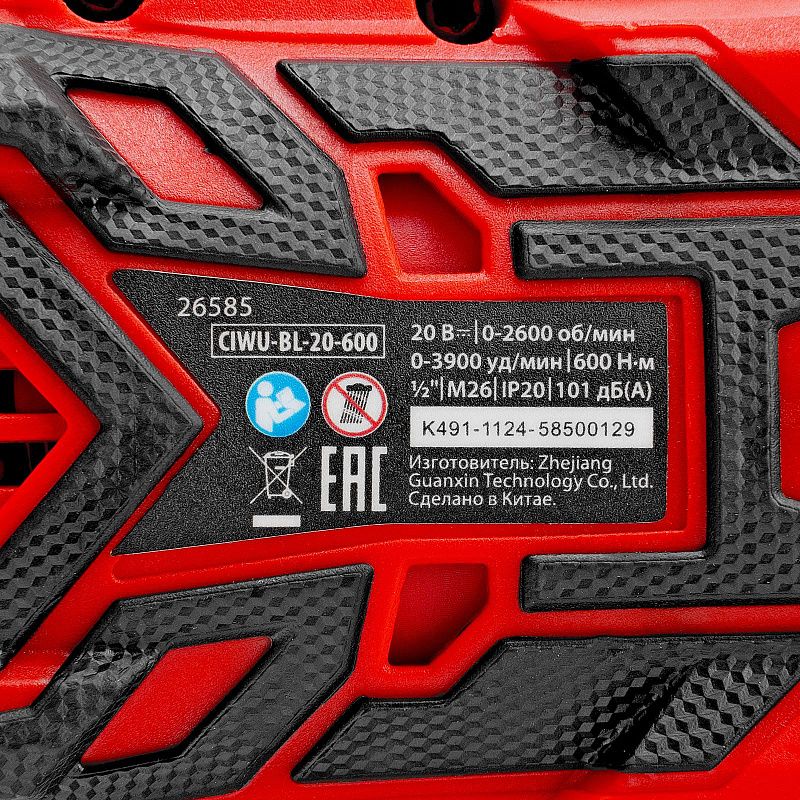Гайковерт ударный аккумуляторный бесщет. CIWU-BL-20-600, Li-Ion, 20 В MTX 26585, описание: