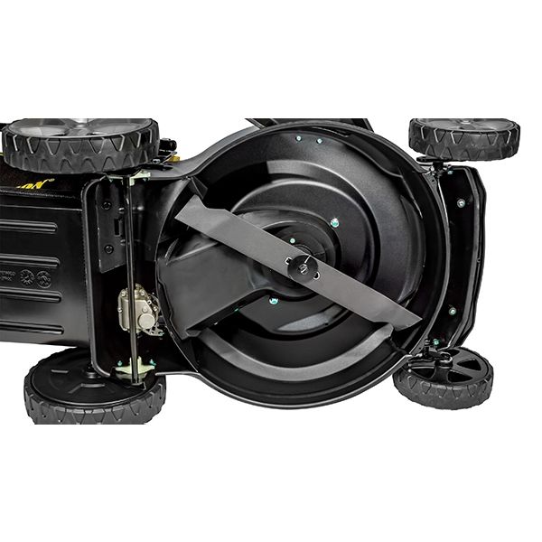 Наличие встроенного штуцера для подключения воды позволяет легко и быстро очистить корпус (деку) газонокосилки от остатков травы. Для этого достаточно подключить шланг с водой к штуцеру, завести двигатель, подать воду и дать поработать газонокосилке несколько минут.