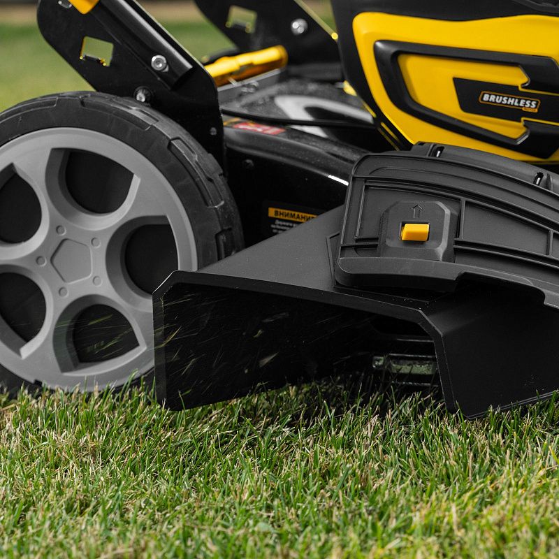 - 3 режима работы — можно выбрать сбор в травосборник, боковой выброс или мульчирование (измельчение травы и равномерное распределение ее по участку).