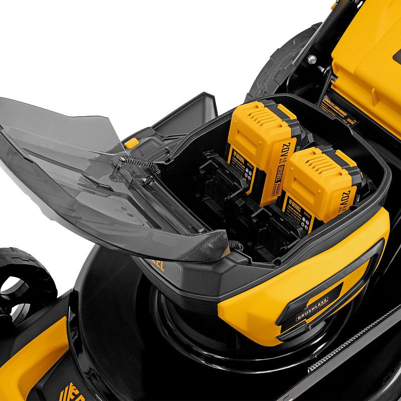 - Длительная работа без подзарядки — в аккумуляторный отсек можно установить 4 батареи: когда одна пара разрядится, косилка продолжит работать, питаясь от двух оставшихся аккумуляторов.