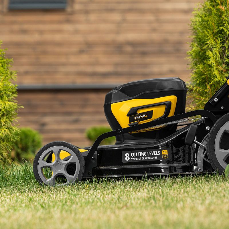 - Быстрая зарядка — газонокосилка будет готова к работе через 1,5 часа.