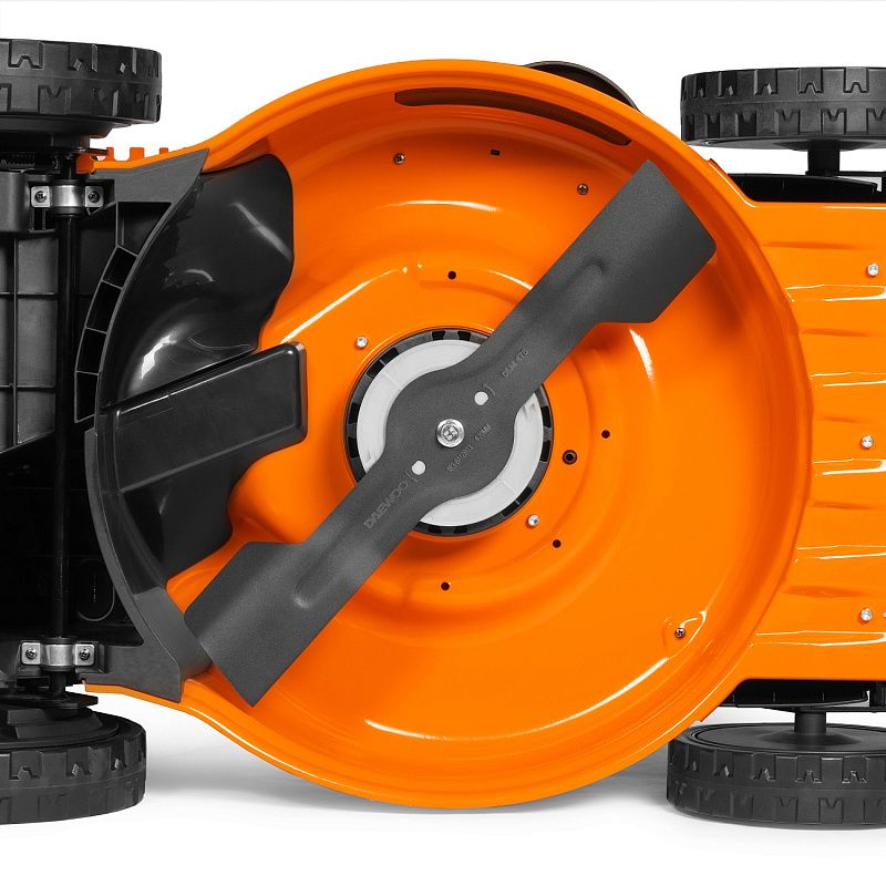 - Колеса увеличенного диаметра. Колеса увеличенного диаметра на подшипниках позволяют косилке легко работать даже на неровных участках и иметь хорошее сцепление с поверхностью. Закрытая внутренняя часть колес предотвращает попадание травы и грязи внутрь механизма колеса.