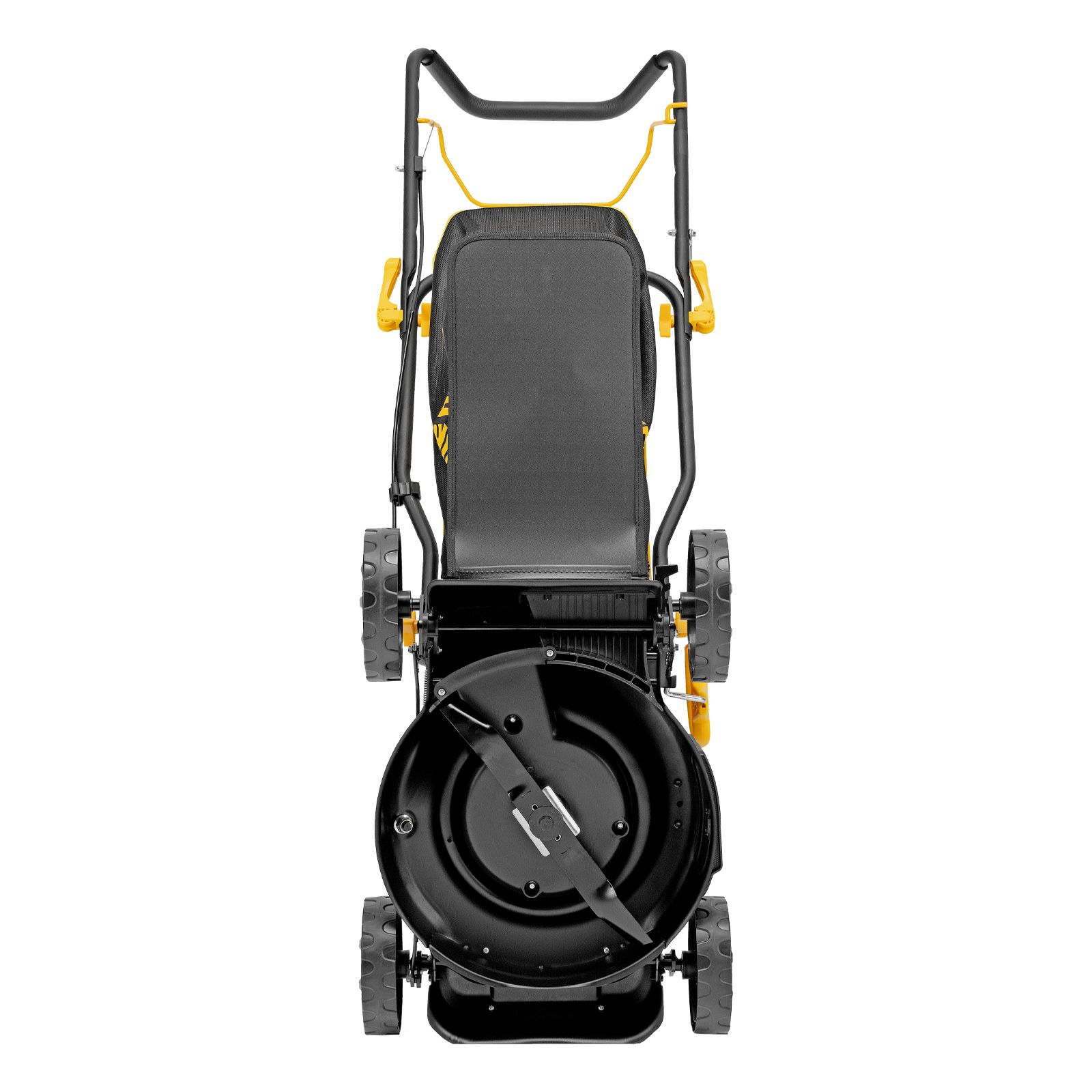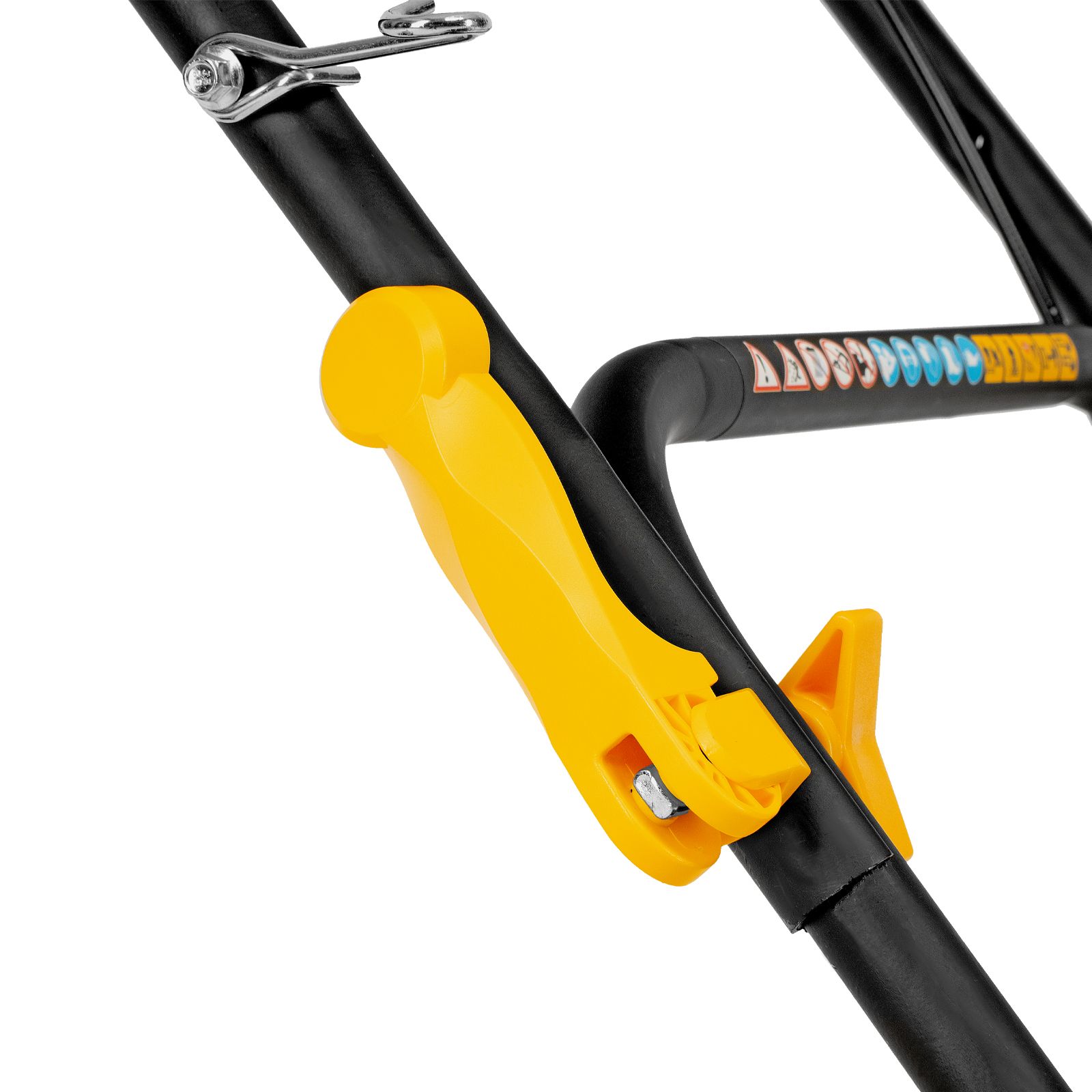 - Продуманная конструкция — рукоятка с эксцентриковыми фиксаторами легко складывается, поэтому газонокосилка не занимает много места в зоне хранения.