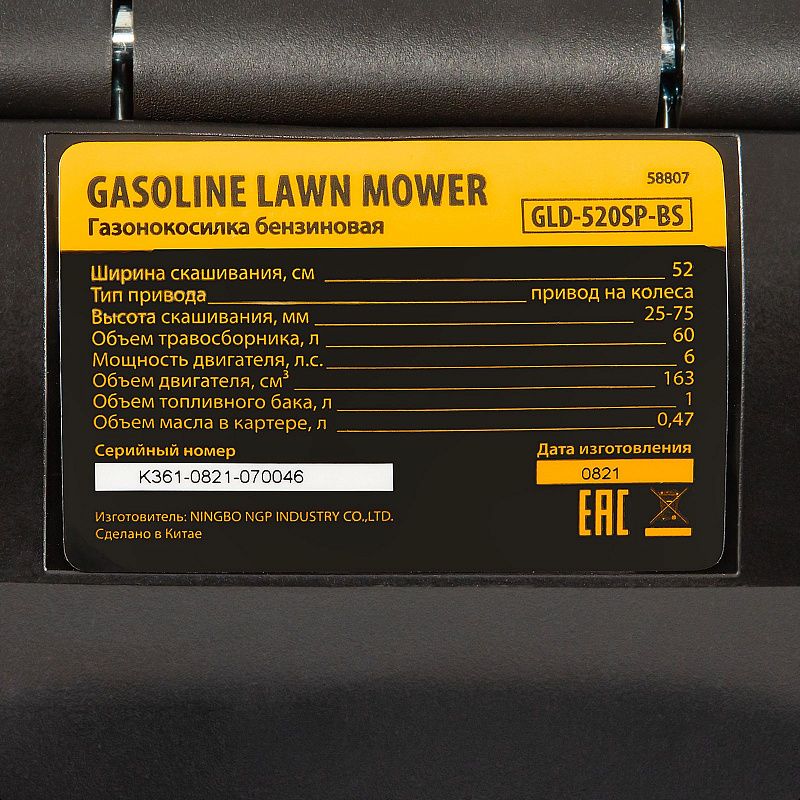 Газонокосилка бензиновая GLD-520SP-BS, 163 см3, Briggs Stratton, ширина 52 см, привод, 60 л Denzel 58807, описание: